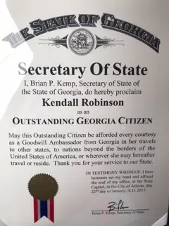 On January 22, 2018, she received the Outstanding Georgia Citizen Award from Georgia Secretary of State, Brian P. Kemp, on January 22, 2018 for her outstanding efforts to assist the homeless and those effected by natural disasters.